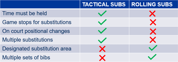 Due to the use of central timing for community netball, even a handful of additional stops in play may cause rolling delays to game times. As a result, Netball NSW endorsed the use of rolling substitutions in community netball in place of the tactical changes rule.